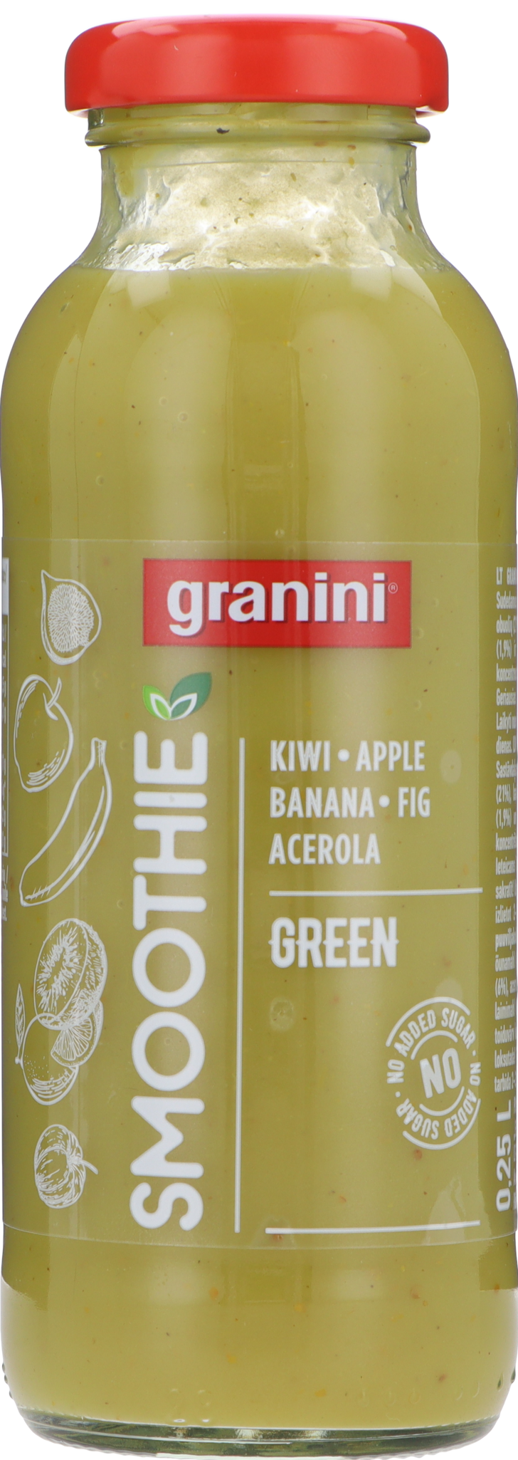 Kiviai, obuoliai, apelsinai bei avokadai susijungė granini žaliajame vaisių kokteilyje. Šie puikiai mums žinomi vaisiai papildyti sočiais bananais, egzotinėmis figomis ir laimais bei naudingosiomis acerolomis. O visas šis išskirtinis vaisių derinys praturtintas melsvadumblio spirulinos ekstraktu. Paragauk išskirtinio glotnučio! Be jokios abejonės granini vaisių kokteilyje nėra pridėtinių cukrų, dažiklių ar konservantų.
