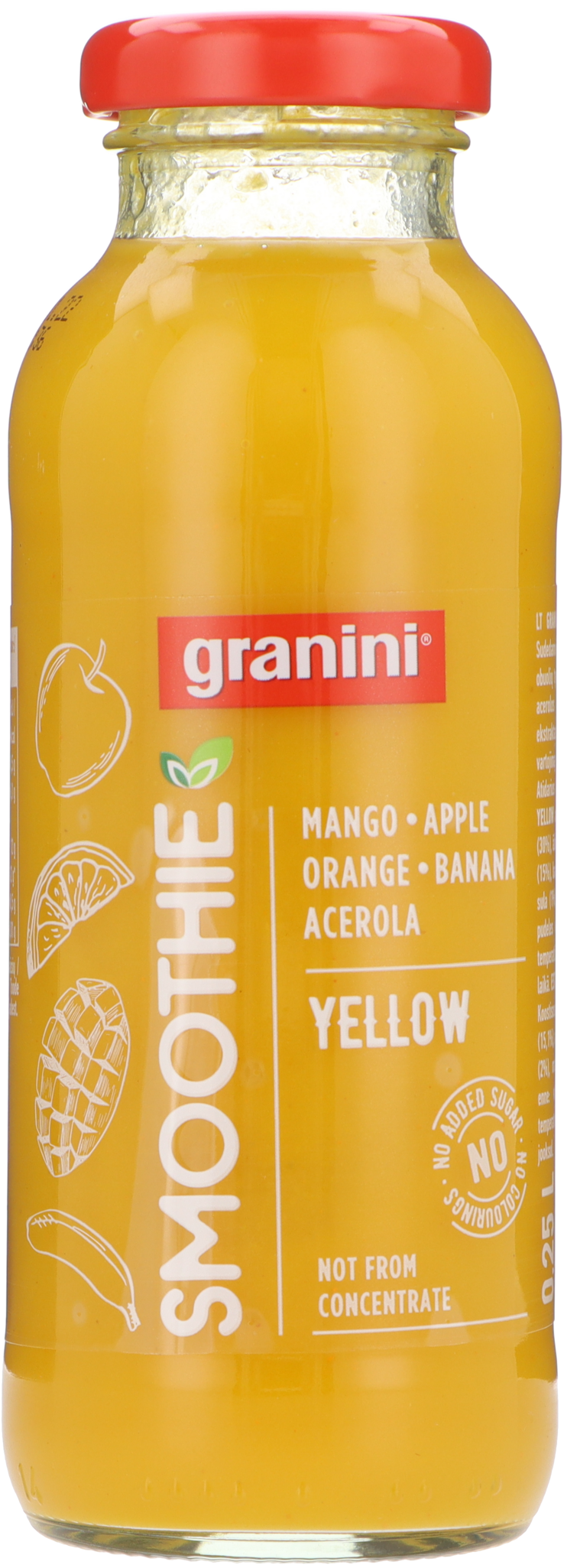 Svaigus mangų aromatas ir skonis, papildytas saulės išlepintais apelsinais ir obuoliais. Tai granini geltonasis vaisių kokteilis. Vaisių trio papildytas sočiais bananais, naudingąja acerola bei kerintį aromatą kuriančiomis pasifloromis. Pasinerkite į šį egzotinį skonį ir paverskite savo dieną neužmirštama!